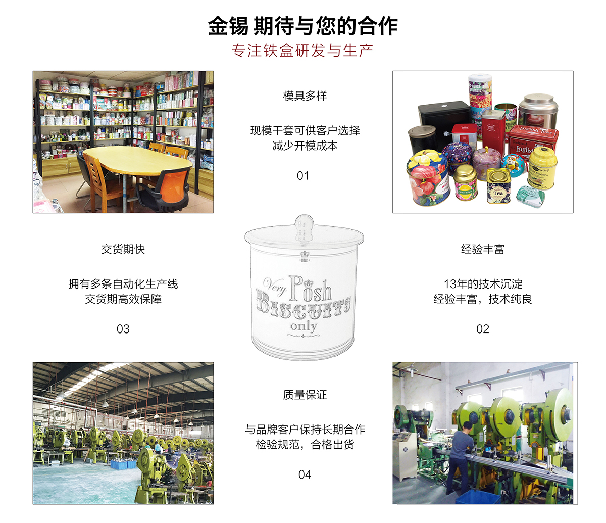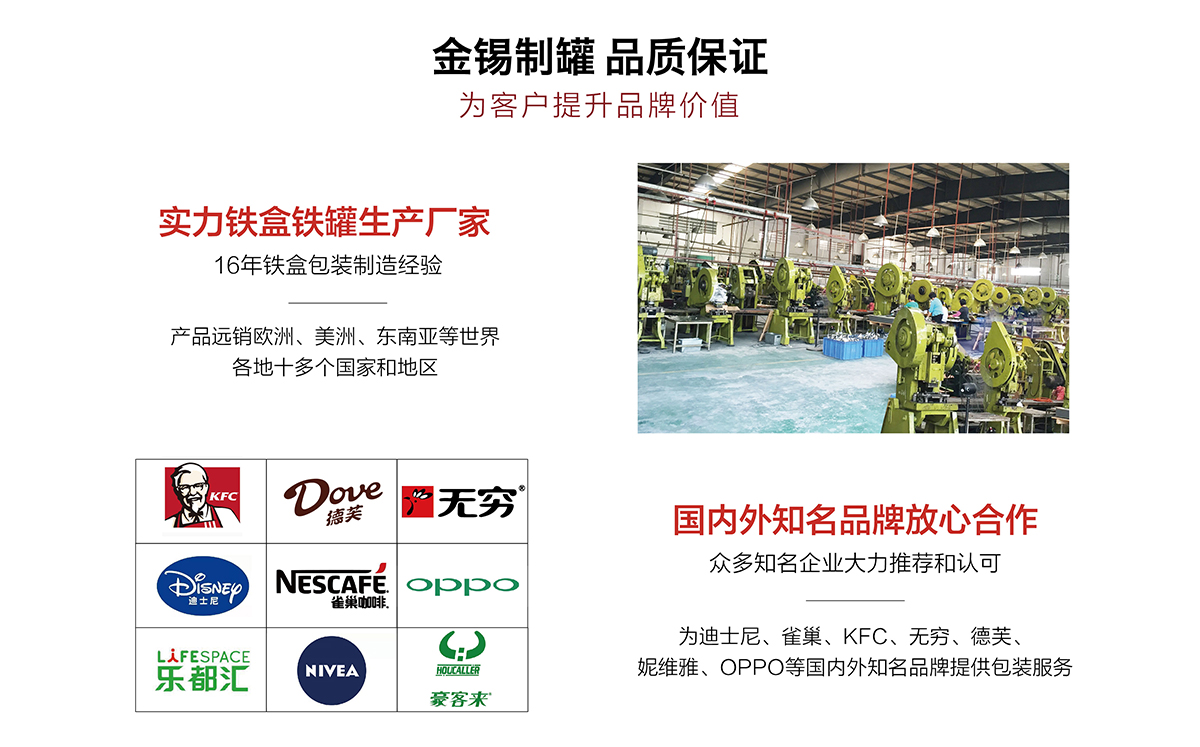 廣州市金錫五金制品有限公司成立于2016年,是已有13年生產(chǎn)經(jīng)驗(yàn)的實(shí)力廠家。我廠是專業(yè)定制優(yōu)良馬口鐵盒、鐵罐、禮品盒、茶葉罐、月餅盒等金屬鐵盒包裝的制罐企業(yè),我們擁有超過(guò)6000平方米的標(biāo)準(zhǔn)現(xiàn)代化廠房及八條生產(chǎn)線。公司集產(chǎn)品研發(fā)、設(shè)計(jì)、生產(chǎn)、銷售于一體,技術(shù)優(yōu)良,實(shí)力雄厚。通過(guò)十多年的制罐經(jīng)驗(yàn),我們擁有專業(yè)的技術(shù)團(tuán)隊(duì),嚴(yán)格的作業(yè)流程、完整的品質(zhì)保障體系、完善的銷售以及售后服務(wù)系統(tǒng)。